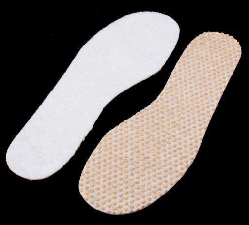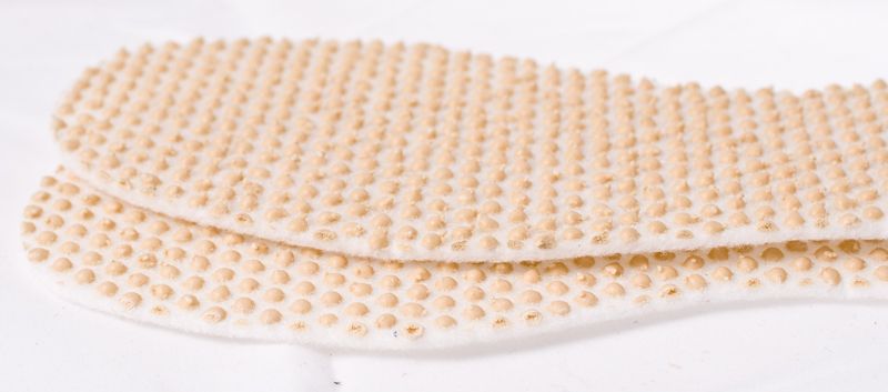 Wkładki filcowe z gumowymi kuleczkami: Pobudzają krążenie krwi. Zapobiegają odciskom i odparzeniom. Dodatkowo amortyzują wstrząsy podczas chodzenia. Pasuje do wszystkich rodzajów butów. Grubość około 3 -4 mm.