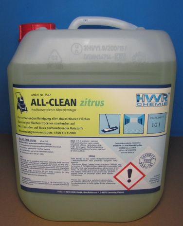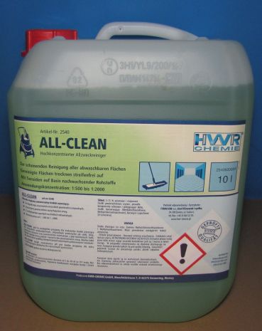 ALL-CLEAN art.nr 2540,- jest to szczególnie przyjazny dla środowiska środek czyszczący dla wszystkich wodoodpornych, zmywalnych powierzchni jak szkło, okna, tworzywa sztuczne oraz powierzchnie marmurowe, z płyt kamiennych i kafli, którym nadaje nowy połysk i wysycha bez pozostawiania smug.Idealny także dla powierzchni podłóg zabezpieczonych warstwami polimerowymi i woskami. ALL-CLEAN dzięki pH neutralnej wartości jest bardzo przyjazny dla skóry i nadzwyczajnie delikatny dla czyszczonych powierzchni.