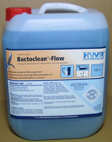 BACTOCLEAN-FLOW eliminuje przykre zapachy z odpływów kuchennych. Zapobiega zatykaniu rur odpływowych i przedłuża znacznie interwały separatorów tłuszczowych. Składniki organiczne zostają całkowicie zredukowane.