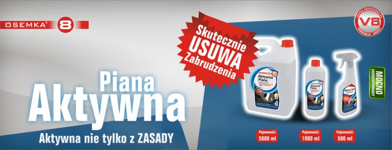 Dzięki zaawansowanej formule doskonale usuwa zabrudzenia z olejów, smarów, tłuszczy i sadzy. Skład preparatu został opracowany specjalnie pod kątem zastosowania w przemyśle motoryzacyjnym (do mycia plandek, podzespołów trakcyjnych, silników, karoserii, felg, części wykonanych z aluminium oraz z plastiku). Niezastąpiony w kompleksowym czyszczeniu pojazdów komunikacji publicznej (zarówno wewnątrz jak i na zewnątrz). V8 Piana Aktywna jest środkiem łagodnym dla wszelkiego rodzaju uszczelek. Nie pozostawia białych osadów i chroni przed utratą koloru uszczelki.