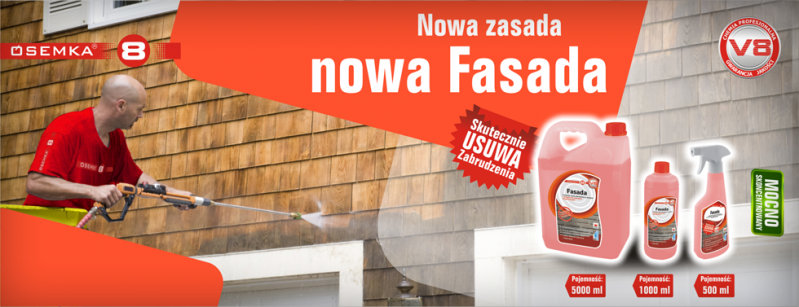 Środek do usuwania różniego rodzaju zabrudzeń z fasad wykonanych z płytek ceramicznych, kamienia sztucznego i naturalnego, cegieł, betonu oraz innych materiałów odpornych na działanie kwasów. V8 Fasada szybko i skutecznie usuwa zabrudzenia wynikające z codziennej eksploatacji i spowodowane warunkami środowiska (zacieki, osady kurzu i pyłu, przebarwienie), jak też pozostałości zapraw, fug i cementu. Zaleca się zawsze przeprowadzenie małej próby na niewidocznej części powierzchni.