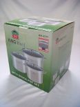 Garnki wykonane z wysokiej jakości stali nierdzewnej.Termiczne trzywarstwowe dno doskonali przewodzi ciepło.Żywność jest szybko podgrzewana,a materiał dobrze utrzymuje ciepło.Odpowiednie do wszystkich rodzajów palników:elektrycznych,gazowych,ceramicznych,halogenowych i indukcyjnych.Doskonałe do zdrowego przygotowywania żywności.Gotowanie z małą ilością wody i tłuszczu ogranicza utratę witamin,minerałów i smaku.Odpowiednie do przygotowywania posiłków dietetycznych.Praktyczne wykończenie zapobiegające wylewaniu.Uchwyty nie nagrzewające się.Brak załamań pozwalających na gromadzenie się cząstek żywności i tłuszczu ułatwia czyszczenie.Przystosowane do używania w piecykach.Łatwe w zachowaniu czystości,można myć w zmywarkach. Wymiary: 1.Średnica 22 x 19 cm 7.2 L 2.Średnica 24 x 20 cm 9.0 L 3.Średnica 26 x 21 cm 11.1 L