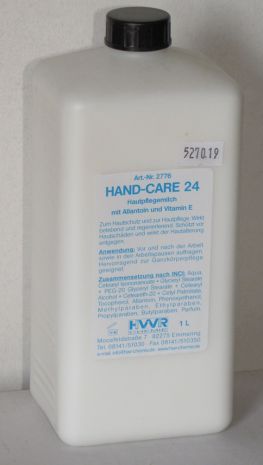 HAND -CARE 24 art.nr 2776,- jest używany do zapobiegania uszkodzeniom skóry rąk spowodowanych pracą zawodową, jak również jako ożywcze i regenerujące pielęgnowanie całego ciała.HAND -CARE 24 zawiera w składzie substancje nawilżająco ochronne oraz posiada wartość pH neutralną dla skóry. Witamina E chroni przed uszkodzeniami skórnymi i przeciwdziała starzeniu się skóry. Allantoina wspomaga regenerację komórek oraz wygładza i uelastycznia skórę.