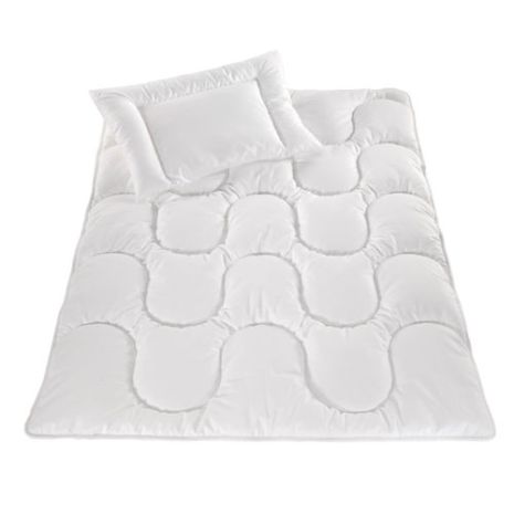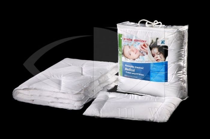 Komplet dziecięcy to zestaw poduszki i kołderki w bardzo delikatnej tkaninie. Dostępny z białym kolorze. Zastosowane wypełnienie sprawia, że komplet może być wykorzystywany u dzieci ze skłonnościami do alergii. Różne wymiary.