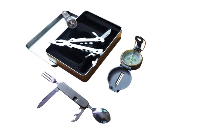 W zestawie - latarka, kompas, multitool, scyzoryk biwakowy, aluminiowe opakowanie