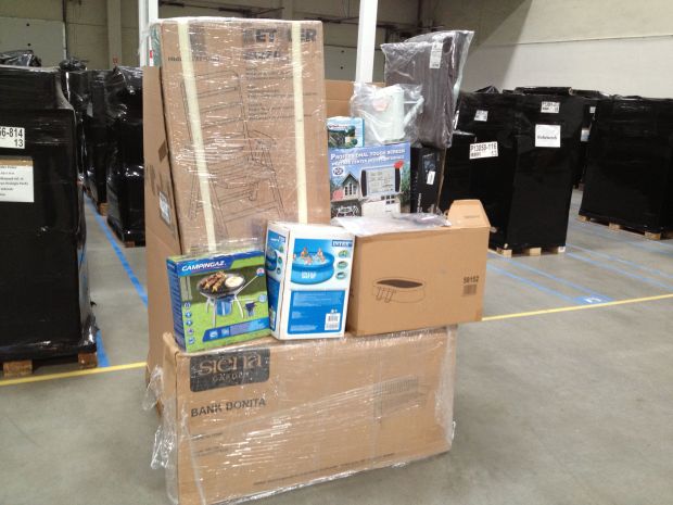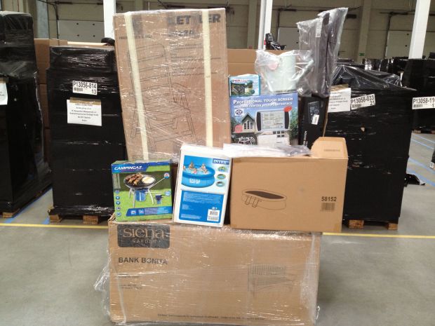 Przykładowe produkty znajdujące się na palecie, to: elektronarzędzia, baseny, meble ogrodowe, parasole, drobne akcesoria.