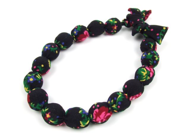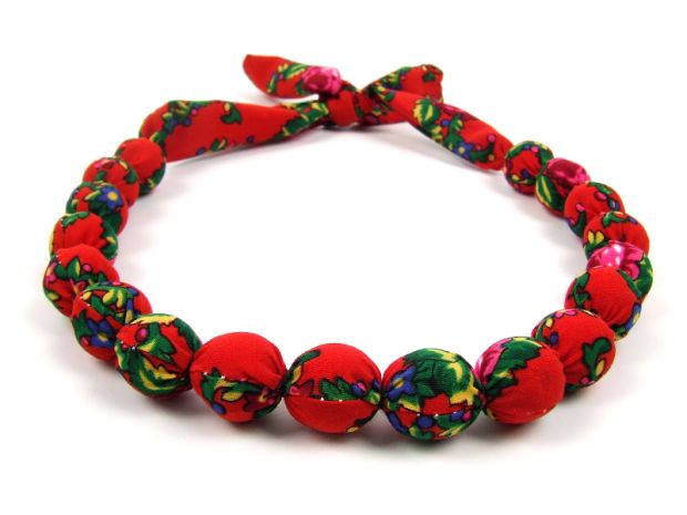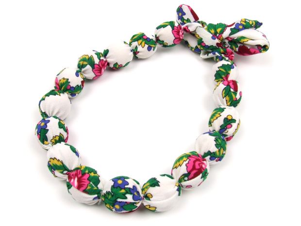 Korale drewniane o średnicy kulek 2 cm, obszyte materiałem (wiskoza). Dostępne wszystkie kolory widoczne na zdjęciach plus: różowy, żółty, błękitny, jasny zielony.