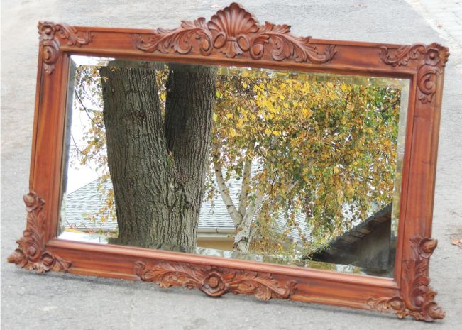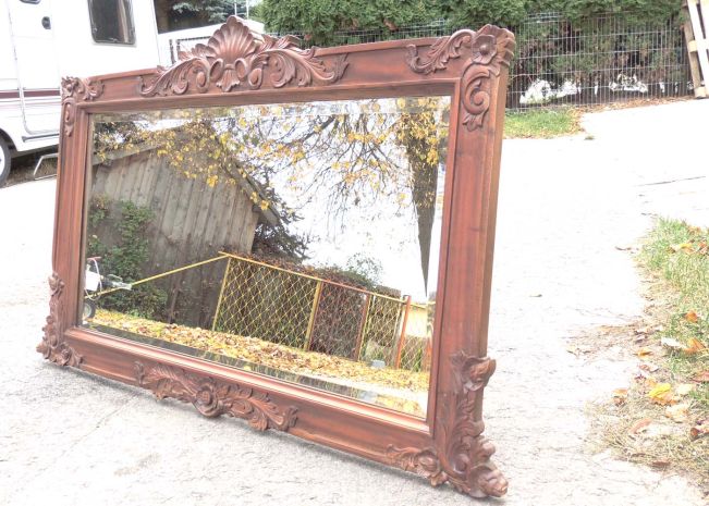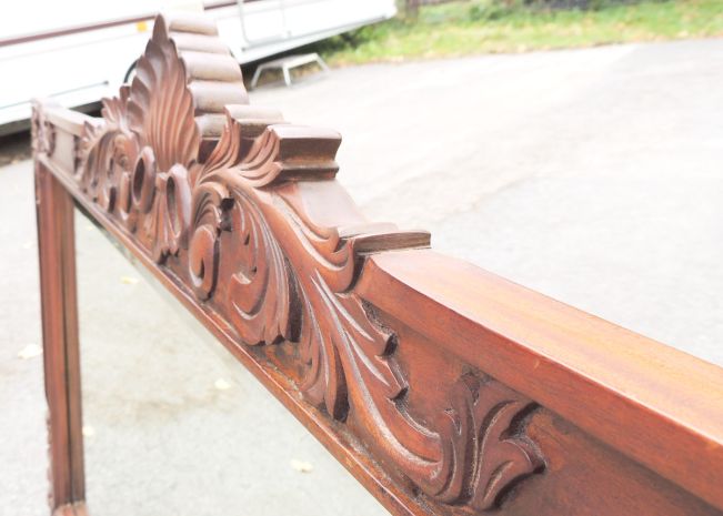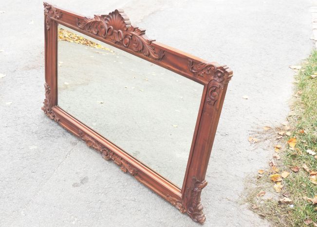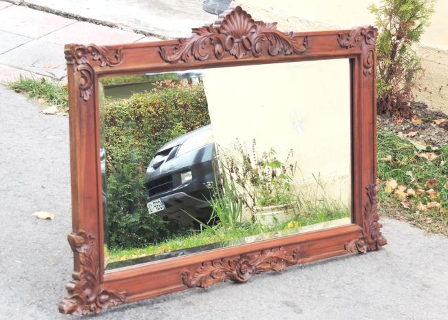 Wykonana recznie przez naszych stolarzy z najlepszej jakosci drewna mahoniowego, Niewierygodnie misternie wykonana replika lustra francuskiego z XVIIw. Z zachwytem patrze na swoich artystow – rzezbiarzy jak oni to przy pomocy dłut i młotka wspolczesnie robią. Wykonczylismy rame w ‘glaze’ (przyciemnienia w głębi rzeźbień) co dodalo antycznej patyny. Lustro jest krysztalowe, fazowane. |