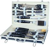 W zestawie: - szpikulec 12 szt. - nóż mały 6 szt. - widelec mały 6 szt. - szczotka - nóż do mięsa - pędzelek - widelec do mięsa - łopatka - szczypce - stal nierdzewna - uchwyty czarne - walizka aluminiowa