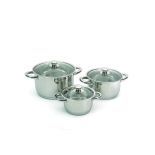 Zestaw składa się z: - Garnka 16 cm, 1,6 l pojemności, - Garnka 20 cm, 3 l pojemności, - Garnka 24 cm, 5,2 l pojemności. Materiał: stal nierdzewna. 3-warstwowe dno. Szybki i równomierny rozkład ciepła. Można myć w zmywarce. Dostosowane do wszystkich rodzajów źródeł ciepła.