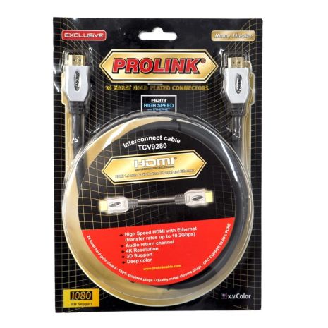 Kabel Prolink EXCLUSIVE HDMI TCV 9280 to najwyższej jakości kabel HDMI przeznaczony do podłączania urządzeń kina domowego, dekodera, PC czy konsoli. Seria EXCLUSIVE przeznaczona jest dla najbardziej wymagających użytkowników. Przewodnik kabla został wykonany z miedzi beztlenowej OFC o czystości 99,96%. Dla najlepszej jakości styku wtyki zostały pokryte 24-karatowym złotem. Przesyłanie sygnału bez zakłóceń zapewnia pełne ekranowanie przewodu. Zgodność z najnowszymi standardami oraz technologiami sprawiają, że kabel HDMI EXCLUSIVE znajduje zastosowanie wszędzie tam, gdzie potrzebna jest najlepsza jakość obrazu i dźwięku oraz stosunkowo niska cena.