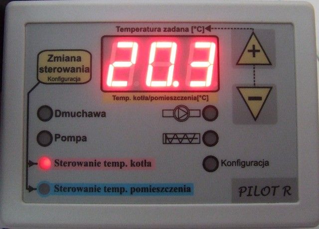 2. Kontrolę parametrów kotła z możliwością podnoszenia i obniżania temperatury wody na kotle c.o. Panel posiada diody kontrolne pokazujące działanie pompy co oraz ewentualnie pompy cwu, dmuchawy oraz podajnika.