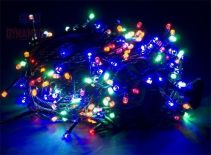 Lampki choinkowe na zielonym przewodzie z wtyczką łączeniową umożliwiającą połączenie kilku kompletów w jedną całość oraz z programatorem.