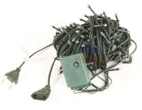 Lampki choinkowe na zielonym przewodzie z wtyczką łączeniową umożliwiającą połączenie kilku kompletów w jedną całość oraz z programatorem.