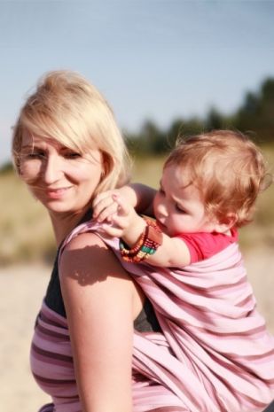 pozycje: “brzuszkiem do brzuszka”, kołyska, na plecach, na boku - w przypadku tej chusty istnieje nieograniczona ilość wiązań.