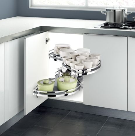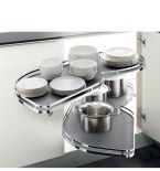STARCORNER to elegancki system półek narożnych z cichym domykiem, wykończony obrzeżem ze stali pokrytej chromem. Umożliwia wykorzystanie przestrzeni szafek narożnych, dając wygodny dostęp do przedmiotów w nich umieszczonych.