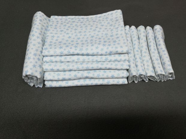 Pieluchy o standardowym rozmiarze 60/80cm(+/-2cm). Wykonane zostały ze 100% bawełny, o gramaturze tkaniny około 140g/m2. Pakowane są w paczki po 5 sztuk, w dwóch zestawach kolorystycznych: dla chłopca i dziewczynki. Stanowią niezbędny element wyprawki porodowej, doskonale sprawdza się w szpitalu, podczas wizyt w przychodni, jako podkładka na przewijak lub wagę. Starszym dzieciom służą jako prztytulanki do snu.