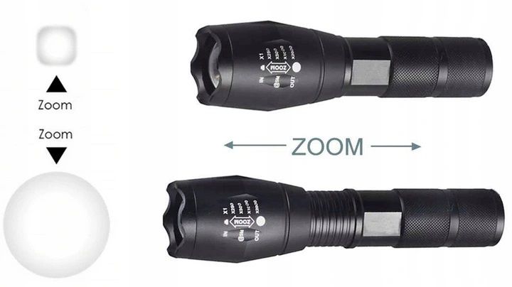 LATARKA WYPOSAŻONA W FUNKCJĘ ZOOM. ZMIENNA OGNISKOWA Z PEŁNĄ REGULACJĄ , UMOŻLIWIAJĄCA OŚWIETLENIE BLIŻSZYCH I DALSZYCH OBIEKTÓW!!!