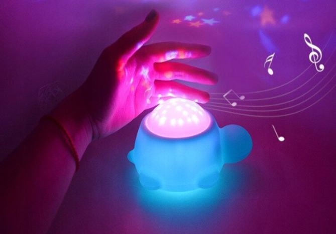 Żółw jest wspaniała nocną lampką do pokoju dziecięcego z kolorowym projektorem. Projektor posiada wzór gwiazdek, które fantastyczne będą wyglądać na ścianie lub suficie w pokoju malucha.