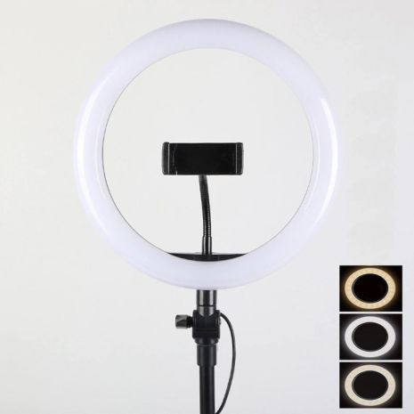 RING LED o wielkości 26 cm wraz z regulowanym statywem, pilotem do zmiany źródła światła (zimne, ciepłe i neutralne)