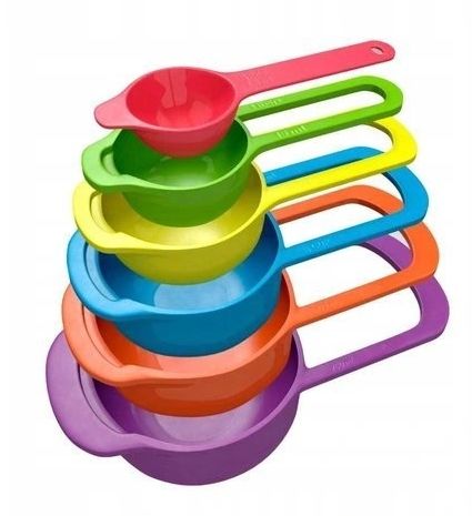 NOWOŚĆ MIARKI KUCHENNE ZESTAW 6 SZTUK Miarki: 7,5ml (1/2 łyżeczka) 15 ml (1 łyżeczka) 60 ml (1/4 szklanka) 85 ml (1/3 szklanka) 125 ml (1/2 szklanka) 250 ml (1 szklanka) Wykonane z tworzywa