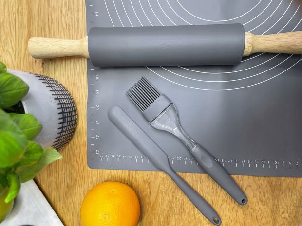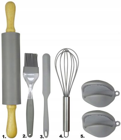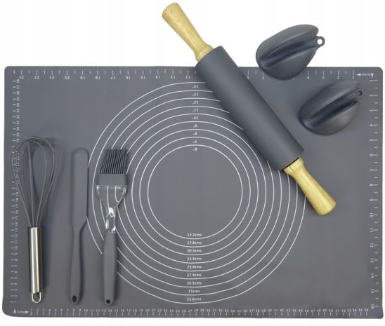 Stolnica idealnie przylega do stołu lub blatu. Górna powierzchnia wykonana została z porowatej struktury co zapobiega przywieraniu ciasta. Stolnica posiada również przydatne okręgi z wpisaną średnicą oraz boczne miarki. W zestawie znajduje się funkcjonalny, silikonowy wałek do ciasta z drewnianymi uchwytami, który nie nasiąka płynami i zapachami ale przede wszystkim nie klei się do ciasta. Zawiera on również nóż silikonowy, trzepaczka do jajek, pędzelek silikonowy oraz kuchenne łapki silikonowe.