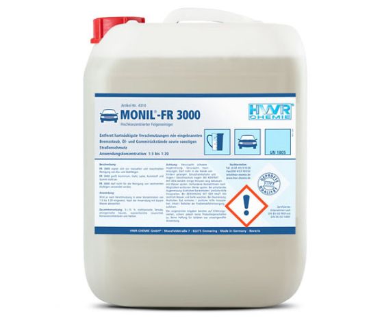 Opis: MONIL-FR 3000 nadaje się do ręcznego oraz automatycznego czyszczenia felg aluminiowych i stalowych. FR 3000 nie uszkadza powierzchni aluminiowych, stalowych, lakieru, gumy, tworzyw sztucznych i innych.