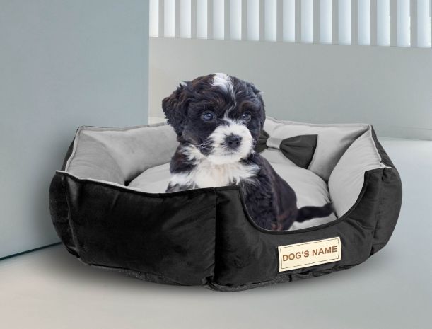 Trwałe WELUROWE legowisko dla psa, rozbieralne z antypoślizgowym spodem w kolorze szaro-czarnym, PERSONALIZOWANE imieniem pupila!