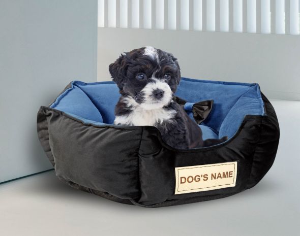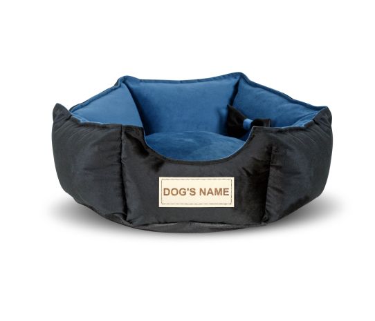 Trwałe WELUROWE legowisko dla psa, rozbieralne z antypoślizgowym spodem w kolorze niebiesko-czarnym, PERSONALIZOWANE imieniem pupila!