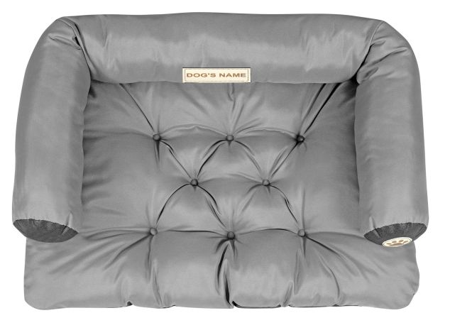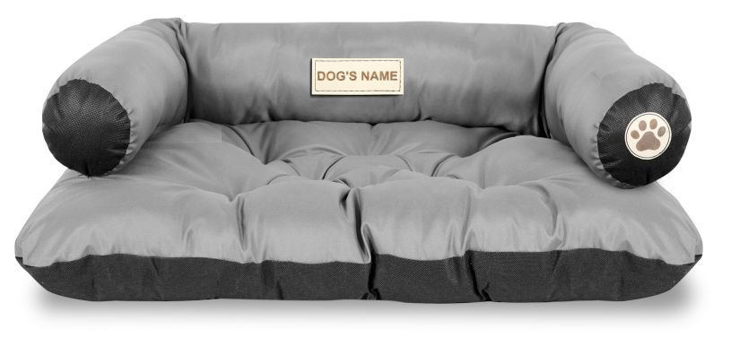 Wytrzymałe, wyjątkowe WODOODPORNE legowisko dla psa SOFA w kolorze szarym, PERSONALIZOWANE imieniem pupila!