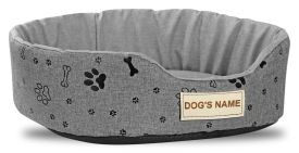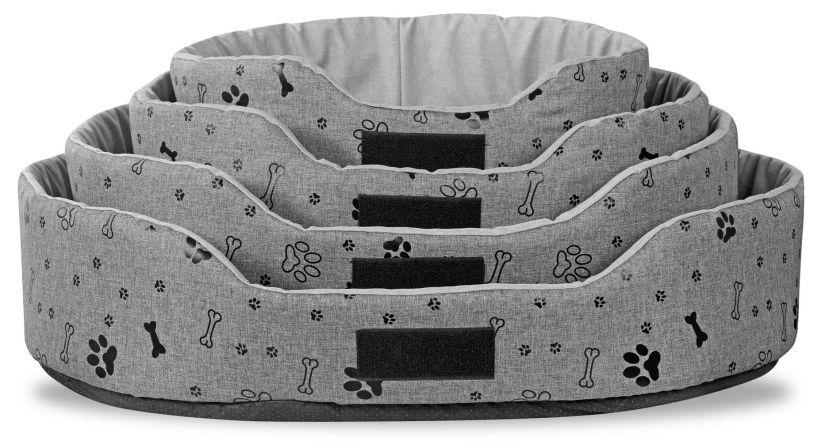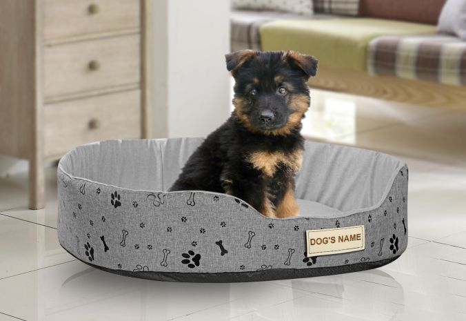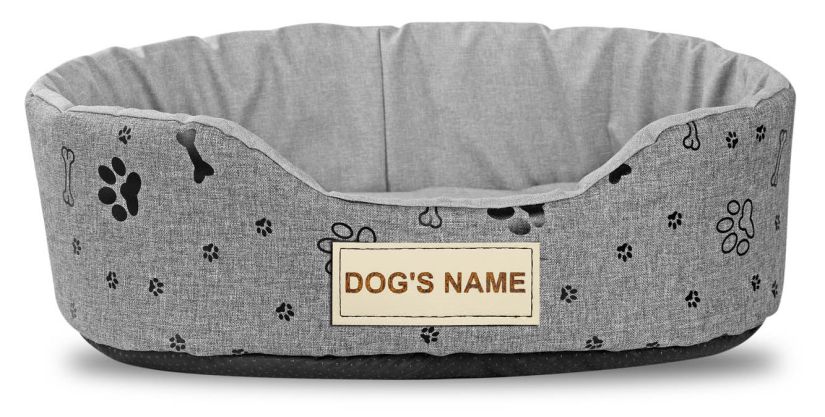 Wytrzymałe wodoodporne OWALNE legowisko dla psa KOŚCI CZARNE w kolorze szarym, PERSONALIZOWANE imieniem pupila!