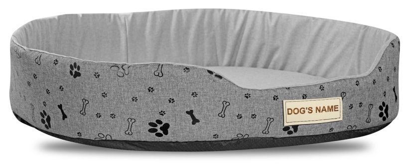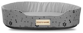 Wytrzymałe wodoodporne OWALNE legowisko dla psa KOŚCI CZARNE w kolorze szarym, PERSONALIZOWANE imieniem pupila!