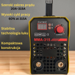 Spawarka oferuje szeroki zakres regulacji prądu od 20A do 315A, co umożliwia wykorzystanie jej w wielu technikach spawania oraz przy różnych materiałach, takich jak stal czy żeliwo. Wysoki cykl pracy na poziomie 60% przy maksymalnym obciążeniu pozwala na dłuższą, nieprzerwaną pracę, wspieraną przez wydajny system chłodzenia powietrzem. Zastosowana technologia IGBT zwiększa efektywność energetyczną, redukuje ilość odprysków i zapewnia wysoką stabilność łuku. Dzięki wadze zaledwie 2,5 kg MMA-315 jest łatwa do przenoszenia i przechowywania, a klasa ochrony IP21 oraz izolacja klasy F gwarantują bezpieczeństwo i trwałość nawet w trudnych warunkach pracy. Cyfrowy wyświetlacz oraz pokrętło regulacyjne umożliwiają precyzyjne ustawienie parametrów dla profesjonalnych efektów.