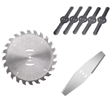 - Wiele opcji ostrzy: Zawiera wytrzymałe stalowe ostrza do intensywnego cięcia, lekkie plastikowe ostrza do precyzyjnego przycinania oraz ząbkowane ostrza do cięcia trudniejszej roślinności.
