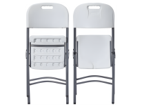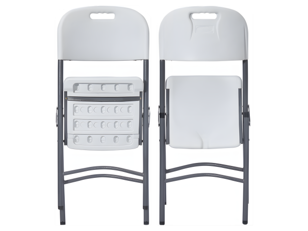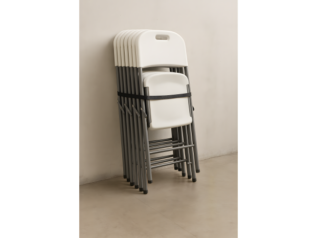 - Składana konstrukcja umożliwia szybkie rozkładanie i składanie krzesła bez użycia narzędzi. Po złożeniu zajmuje niewiele miejsca, co ułatwia magazynowanie i transport większej liczby sztuk.