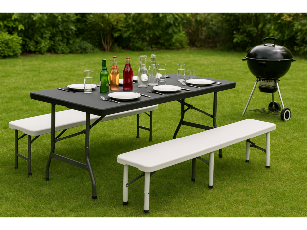 Wysokiej jakości blat z tworzywa HDPE jest odporny na warunki atmosferyczne, promienie UV i zabrudzenia. Metalowa konstrukcja z blokadą zapobiega przypadkowemu złożeniu, a antypoślizgowe stopy zapewniają dodatkowe bezpieczeństwo.