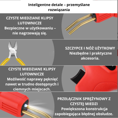 Zgrzewarka ADM do plastiku to wydajne i niezawodne urządzenie stworzone do profesjonalnych napraw. Dzięki szybkiemu nagrzewaniu i precyzyjnej kontroli temperatury idealnie nadaje się do wzmacniania i regeneracji zderzaków, elementów samochodowych, mebli czy domowych akcesoriów plastikowych. Kompaktowa i łatwa w obsłudze, gwarantuje trwałe połączenia oraz wydłuża żywotność uszkodzonych części.