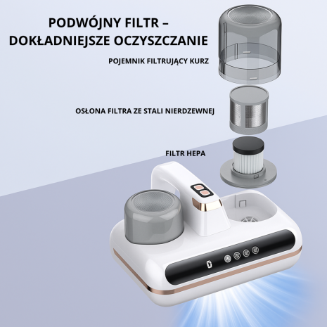 Poznaj nowoczesny sposób na czyste i zdrowe otoczenie dzięki odkurzaczowi do usuwania roztoczy. To zaawansowane urządzenie łączy technologię ultradźwiękową i promieniowanie UV, skutecznie eliminując roztocza, bakterie oraz alergeny z pościeli, materacy, sof i tapicerki. Dzięki wydajnemu silnikowi, ergonomicznemu kształtowi i bezprzewodowej pracy, zapewnia skuteczne czyszczenie oraz wyższy komfort w codziennym użytkowaniu.