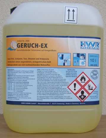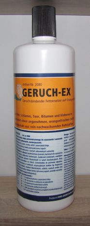 GERUCH-EX art.nr 2080, jest naturalnym roztworem do usuwania: -tłuszczu, osadów szlamu i innych śmierdzących organicznych zabrudzeń - pozostałości z olejów mineralnych, smoły, bitum i warstw woskowych -pozostałości po kleju i plamy ze smoły na lakierach i płaskich powierzchniach.