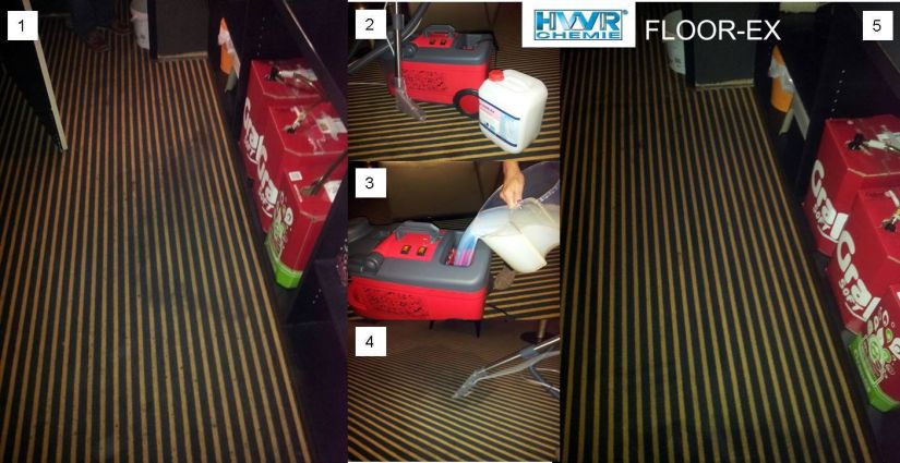FLOOR-EX to doskonały preparat do pielęgnacji Rozpuszcza i wiąże cząsteczki brudu. Nie przyczepia się do włókien. Nie zawiera fosforanów i agresywnych substancji niszczących. FLOOR-EX rozcieńcza się z wodą w proporcji od 1 : 10 do 1 : 20. Temperatura wody 20 – 60 stopni C. Przy praniu wstępnym ustawić urządzenie tylko na natrysk i na około 2 – 3 minuty pozostawić. Następnie przez natrysk i ssanie usuwać rozpuszczone cząstki brudu.