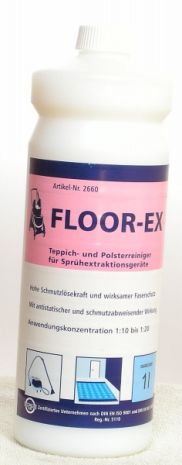 FLOOR-EX art.nr 2660,- to specjalny środek czyszczący do dywanów o działaniu ekstrakcyjnym, o niezwykłej sile czyszczącej. Nie pieni się obficie i posiada dobre własności rozpylające. Wolny od substancji zlepiających włókna.